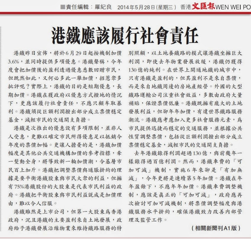 「港鐵應該履行社會責任」,全文如下: