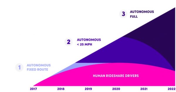 第三階段:將在 2021 或 2022 把 Lyft 現有普通的士全部替換成全自動駕駛汽車。這一階段開始後不久,美國主要城市的汽車保有量將急速下降,而這些都將在